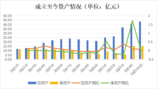整体来看,长江财险总资产在2017年、2020年出现分水岭。2018-2020年该指标逐年下滑至21.45亿元,其余年份均呈现上升趋势。截至2025年一季度,长江财险总资产为43.44亿元。