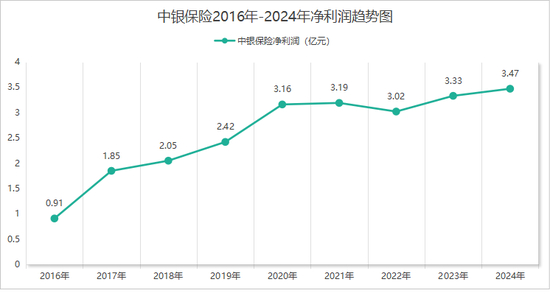 盈利情况上则是另一番景象。中银保险近几年净利保持增长,增速略有放缓,2016年至2024年分别为0.91亿元、1.85亿元、2.05亿元、2.42亿元、3.16亿元、3.19亿元、3.02亿元、3.33亿元、3.47亿元。2017年至2024年对应增长率分别为103%、10.81%、18.05%、30.58%、0.95%、-5.33%、10.26%、4.2%。可以看出,净利润增速由三位数逐步降低至个位数。