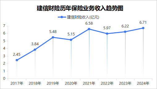 反观建信财险,同样在2020年经历波动,总体上是波动上升的态势。具体来看,建信财险2017至2020年实现保险业务收入2.45亿元、3.84亿元、5.48亿元;2020年下滑6.02%至5.15亿元后,2021年强势反弹27.77%至6.58亿元,2022年至2024年分别为5.97亿元、6.22亿元、6.71亿元,然而2025年一季度同比下降9.25%,至3.53亿元。