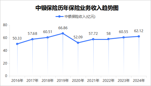 分别来看,近十年间,中银保险经历2020年的大幅波动后仍处在恢复期。2016年至2019年,中银保险相对保持较高增长,分别50.33亿元、57.68亿元、60.51、66.86亿元。2020年受特殊时期影响,该司保险业务收入较2019年大幅降低22.09%至52.09亿元,2021年至2024年间有所恢复,保险业务收入分别为57.72亿元、58亿元、60.55亿元、62.12亿元。即便每年都保持增长,但增速已经明显放缓,2021年至2024年中银保险保险业务收入同比增速分别为10.81%、0.49%、4.40%、2.59%。