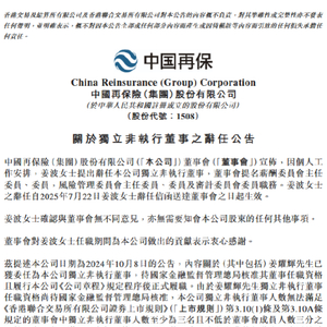 7月22日金融一线消息,中国再保险今日发布公告称,因个人工作安排,姜波女士提出辞任本公司独立非执行董事,董事会提名薪酬委员会主任委员、委员,风险管理委员会主任委员、委员及审计委员会委员职务。姜波女士的辞任自2025年7月22日姜波女士辞任信函送达董事会之日起生效。