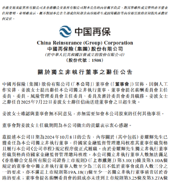 中国再保:姜波辞任独立非执行董事