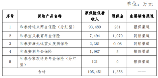 观潮财经发现,2019年度来自分红险的业务收入骤增达9.37亿元,超2018年分红险收入73倍。2019年,和泰好运来两全保险(分红型)的原保费收入十分可观,达到了9.35亿元,远超该公司其余产品。该产品作为一款5年到期的分红险,或与2024年大幅增长的“满期给付”有关。