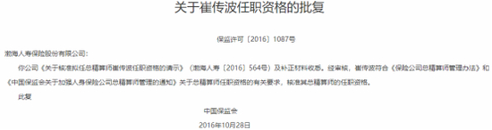 纵观崔传波的职业生涯,其于1999年参加工作,入职新华人寿产品精算部,后任中美大都会人寿精算部经理,法国巴黎财险北京代表处首席代表,索尼人寿北京代表处首席代表。随后于2016年10月,经原保监会批复,担任渤海人寿总精算师一职。