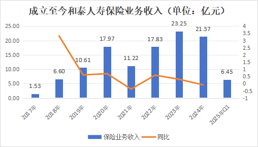 从承保端来看,和泰人寿保险业务收入整体呈现波动上升态势,仅2021年较大幅度下降37.56%,为11.22亿元;2024年小幅下降8.1%,为21.37亿元,其余年份均稳步增长。