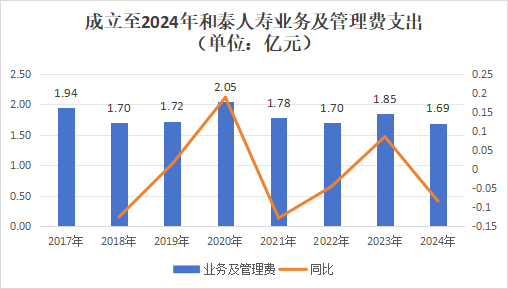 从和泰人寿业务及管理费支出来看,这项数据从成立以来十分稳定,仅2020一年超过2亿元,8年以来年均支出1.8亿元,在平均值上下浮动幅度不超过15%。