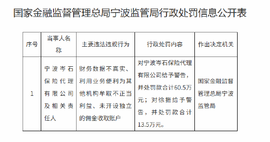 宁波岑石保险代理被罚60.5万元:财务数据不真实等