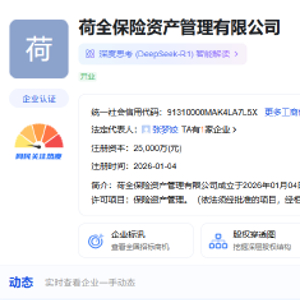 1月5日金融一线消息,爱企查工商信息显示,1月4日,荷全保险资产管理有限公司成立,注册地位于上海市虹口区,法定代表人为张梦姣,注册资本2.5亿人民币。经营范围包括许可项目:保险资产管理。