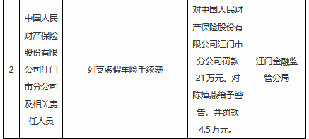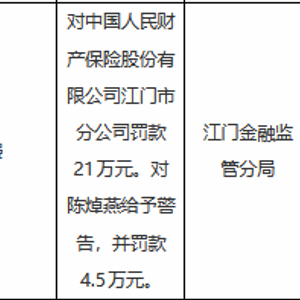 1月5日金融一线消息,国家金融监督管理总局江门监管分局行政处罚信息公示列表显示,中国人民财产保险股份有限公司江门市分公司及相关责任人员列支虚假车险手续费,中国人民财产保险股份有限公司江门市分公司被罚款21万元,陈焯燕被给予警告并罚款4.5万元。