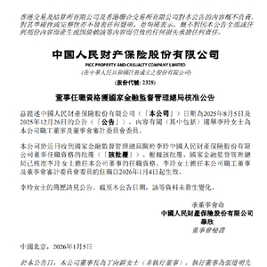 1月5日金融一线消息,中国财险发布公告,职工董事李玲的任职资格已获国家金融监督管理总局核准。李玲担任公司职工董事及董事会审计委员会委员的任职自2026年1月4日起生效。