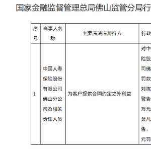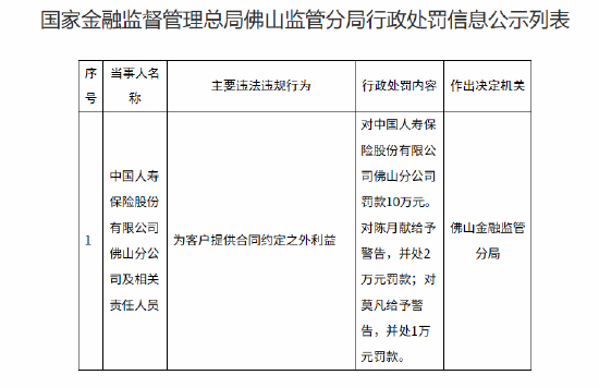 1月14日金融一线消息,据佛山金融监管分局行政处罚信息公开表显示,中国人寿保险股份有限公司佛山分公司因为客户提供合同约定之外利益,被罚款10万元。相关责任人员陈月献被给予警告,并处2万元罚款;莫凡被给予警告,并处1万元罚款。
