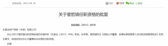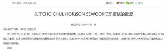 2013年4月,曹哲镐接替尹京洙出任乐爱金财险第三任总经理。次年2月,其董事长的任职资格获批。履历显示,曹哲镐在加入乐爱金财险前,曾长期供职于韩国LIG财险。