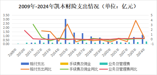 从凯本财险支出端来看,赔付支出因几次重大赔付案件出现峰值,导致该指标波动明显,2015年为历史最高3.07亿元。2024年为1.16亿元。此外,2025年该公司还支付了一笔0.525亿元的重大赔付,该年度赔付支出也将保持在较高水平。