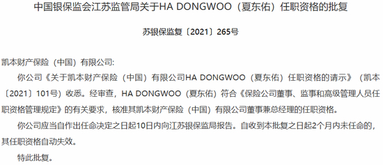 2021年1月起,副总经理兼财务负责人都皓映兼任该公司临时负责人,同年6月,夏东佑正式获批出任凯本财险总经理,直至2025年12月底卸任,由白承珉任临时负责人,任职时间4年半左右。