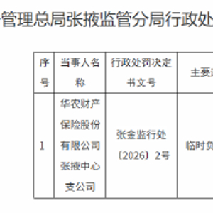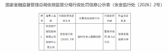 华农财险张掖中心支公司被罚0.6万元:临时负责人超期任职 金融一线 01.2021:07 关注 1月20日金融一线消息,华农财产保险股份有限公司张掖中心支公司因临时负责人超期任职,被警告并处罚款0.6万元。