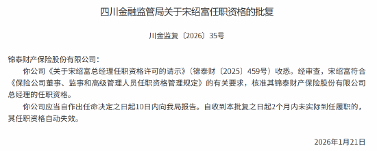 1月27日金融一线消息,四川金融监管局发布批复,核准宋绍富锦泰财产保险股份有限公司总经理的任职资格。