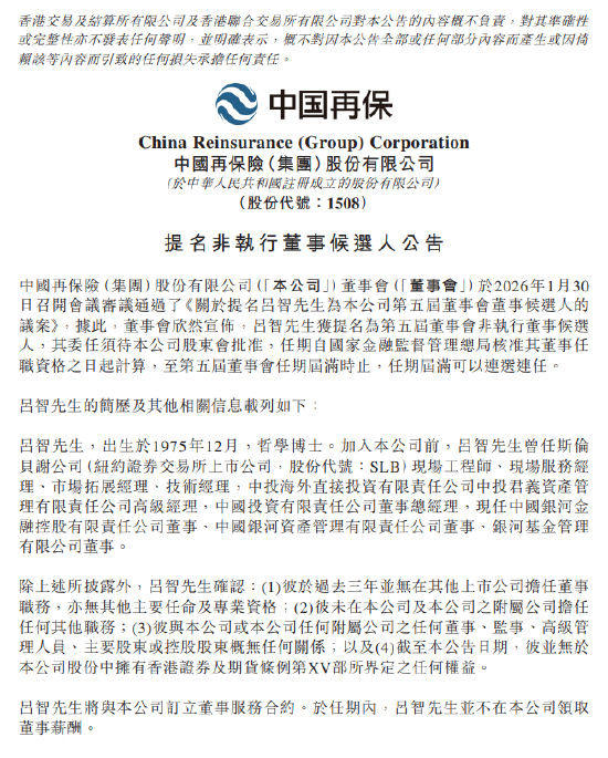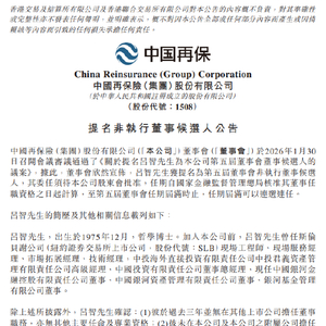 1月30日金融一线消息,中国再保险发布公告称,吕智获提名为第五届董事会非执行董事候选人,其委任须待公司股东会批准,任期自国家金融监督管理总局核准其董事任职资格之日起计算,至第五届董事会任期届满时止,任期届满可以连选连任。