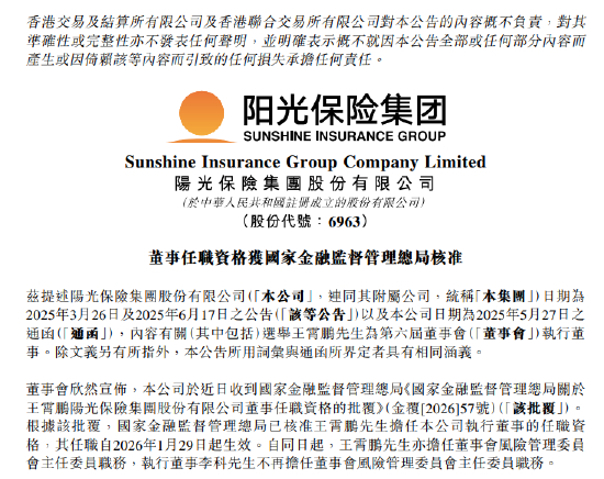 1月30日金融一线消息,阳光保险发布公告称,公司于近日收到国家金融监督管理总局《国家金融监督管理总局关于王霄鹏阳光保险集团股份有限公司董事任职资格的批复》,国家金融监督管理总局已核准王霄鹏担任公司执行董事的任职资格,其任职自2026年1月29日起生效。自同日起,王霄鹏亦担任董事会风险管理委员会主任委员职务,执行董事李科不再担任董事会风险管理委员会主任委员职务。