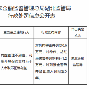 中华联合财险湖北分公司因内控管理不到位被罚,一名责任人被禁业5年