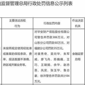 蓝鲸新闻2月28日讯(记者 陈晓娟)刚开年,华安财产保险股份有限公司(下称“华安财险”)就收到一张大额罚单。日前,金融监管总局对其开出565万元罚单,其中,总公司被罚386万元,山东分公司被罚60万元,福建分公司被罚35万元,相关责任人员合计被罚84万元。值得关注的是,相关责任人中的凤奕、徐沛、吴向华,不乏指向华安财险现任两名总经理助理及总精算师。