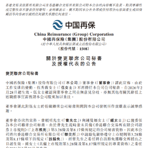 3月2日金融一线消息,中国再保险发布公告称,由于工作安排的变动,伍秀薇不再担任公司公司秘书,亦不再担任公司授权代表,自2026年2月28日起生效。