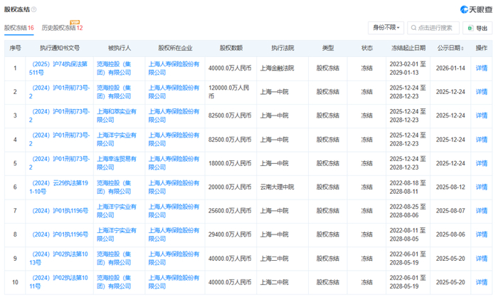 此外,览海系与上海人寿之间股权冻结频现。据天眼查显示,当前共有16条股权冻结记录。
