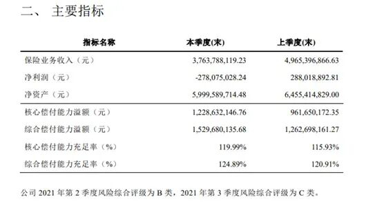 上海人寿偿付能力报告只披露到2021年四季度,据四季度偿付能力报告显示,核心偿付能力119.99%,综合偿付能力124.89%,这一两个指标仅过及格线,未达行业平均水平。更为严峻的是,2021年第三季度,上海人寿成为偿付能力不达标公司,风险等级从B类降至C类。