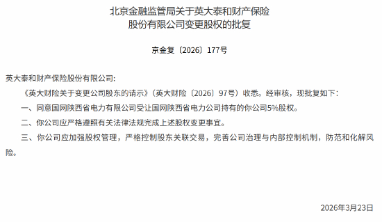 英大财险5%股权变更获批 金融一线 04.0321:52 关注 4月3日金融一线消息,北京金融监管局发布批复,同意国网陕西省电力有限公司受让国网陕西省电力公司持有的英大泰和财产保险股份有限公司5%股权。