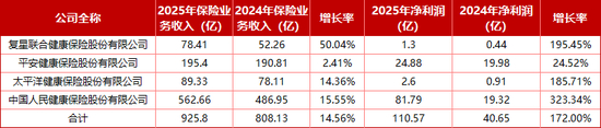 随着四大上市保司年度业绩发布会落幕,人保健康、平安健康、太保健康以及复星联合健康四家专业健康险司的业绩也相继出炉:四家合计实现保险业务收入925.8亿元,同比增长14.56%;净利润110.57亿元,同比大增171.98%。其中,2025年人保健康保险业务收入562.66亿元稳居同业之首。