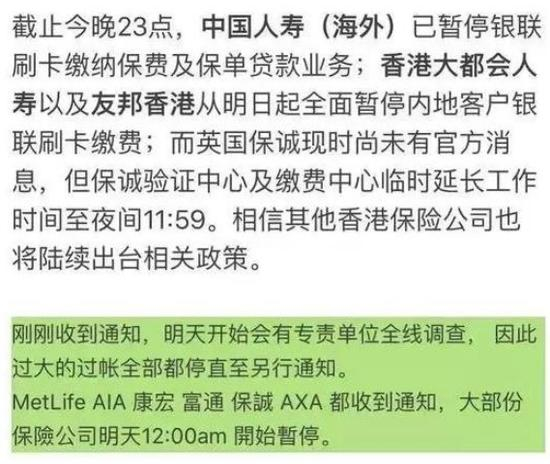 此前,21世纪经济经济报道披露,以“通联支付”缴纳香港保单高额保费的方式已经被有关部门叫停,且银联卡支付亦被严格限制在单笔5000美元以内,一旦超过这一上限,银联卡将面临被锁定的风险。