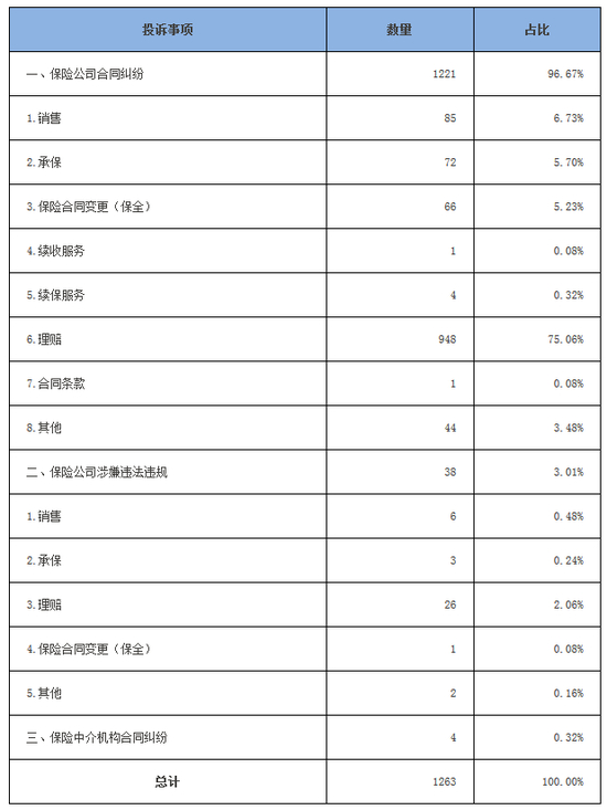 消费者有效投诉涉及财产险的共有1263件。其中,保险公司合同纠纷类投诉1221件,涉嫌违法违规类投诉38件;保险中介机构合同纠纷类投诉4件。涉及财产险的保险公司合同纠纷类投诉中,理赔纠纷948件,占合同纠纷投诉总量的77.64%,主要反映对定损和理赔金额不满、理赔处理时间长、服务态度差等问题。销售纠纷85件,占合同纠纷投诉总量的6.96%,主要反映出险记录导致次年保费上浮争议、营销扰民、投保礼赠送、未经同意承保等问题。承保纠纷72件,占合同纠纷投诉总量的5.90%,主要反映代签字、未及时送达保单和发票等问题。