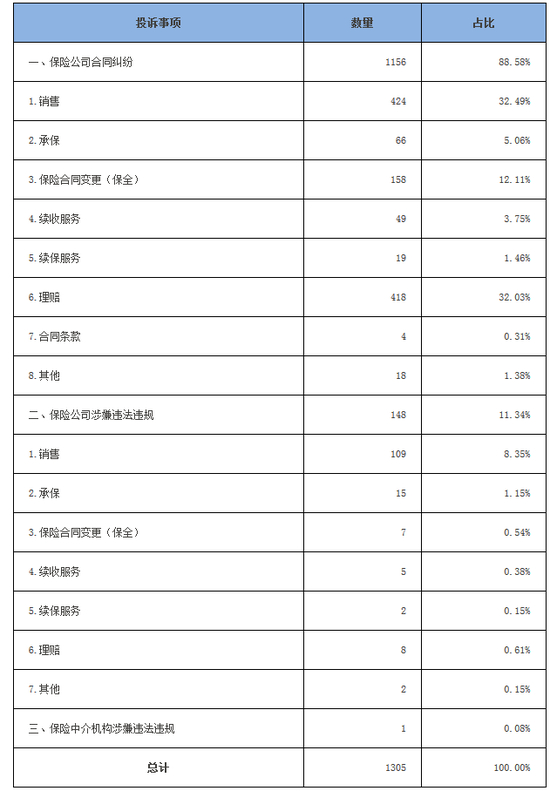 消费者有效投诉涉及人身险的共有1305件。其中,保险公司合同纠纷类投诉1156件,涉嫌违法违规类投诉148件;保险中介机构涉嫌违法违规类投诉1件。涉及人身险的保险公司合同纠纷类投诉中,销售纠纷424件,占合同纠纷投诉总量的36.68%,主要反映夸大保险责任或收益、营销扰民、未告知退保损失等问题。理赔纠纷418件,占比36.16%,主要反映理赔时效和金额争议、投保讲解与实际理赔不符等问题。保全纠纷158件,占比13.67%,主要是对退保损失、处理时效、无服务提醒等问题的不满。