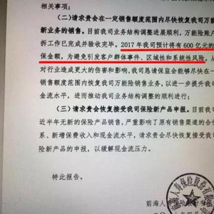 2.请求贵会在一定销售额度范围内尽快恢复我司万能险新业务的销售。2017年我司预计将有600亿元的退保金额,为避免引发客户群体事件、区域性和系统性风险,从而对行业造成更大的伤害和影响