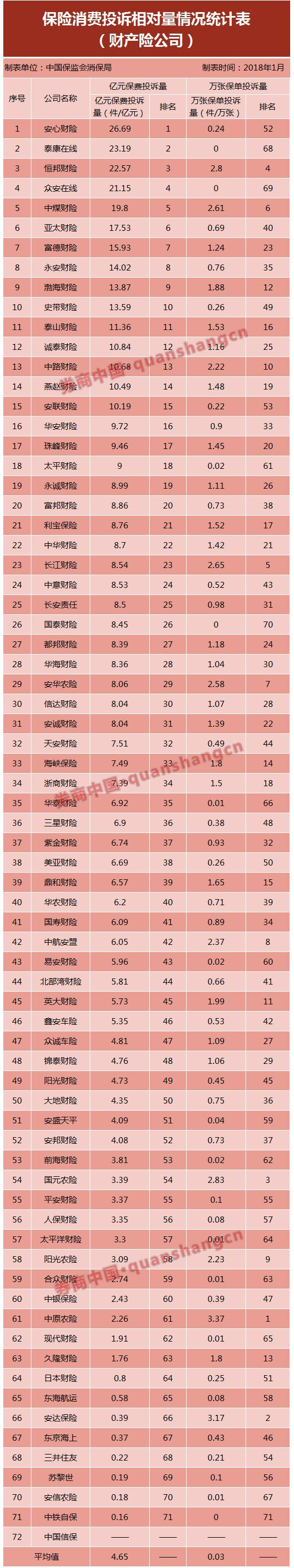 “亿元保费投诉量”方面,2017年财险公司平均值为4.65件/亿元,该指标居前10位的公司为:安心财险(26.69件/亿元)、泰康在线(23.19件/亿元)、恒邦财险(22.57件/亿元)、众安在线(21.15件/亿元)、中煤财险(19.80件/亿元)、亚太财险(17.53件/亿元)、富德财险(15.93件/亿元)、永安财险(14.02件/亿元)、渤海财险(13.87件/亿元)和史带财险(13.59件/亿元)。