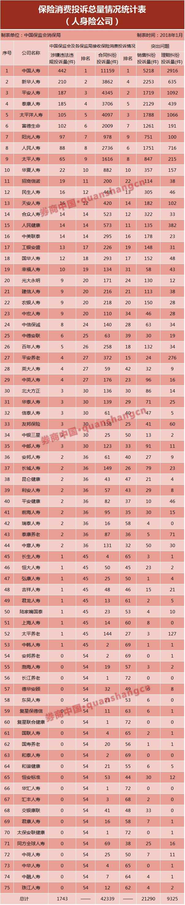 其中,涉嫌违法违规投诉量居前10位的寿险公司为:中国人寿(442件)、新华人寿(210件)、平安人寿(187件)、泰康人寿(185件)、太平洋人寿(105件)、富德生命(102件)、阳光人寿(97件)、人民人寿(88件)、太平人寿(65件)和华夏人寿(22件)。