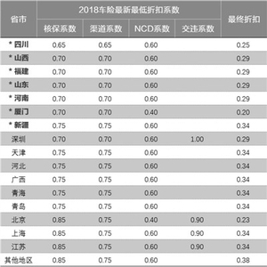 四川地区自主核保系数和自主渠道系数调整为0.65至1.15;山西、福建、山东、河南、厦门等地,自主核保系数和自主渠道系数调整范围均为0.7至1.15;新疆地区自主核保系数和自主渠道系数调整范围均为0.75至1.15。