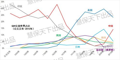 这是一张几个大国占世界GDP的比重变化图,我们可以看到,中国在改革开放后筑底反弹,然而新世纪之前的反弹缓慢而艰难,新世纪之后终于昂首而上。