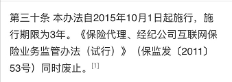 2015年版《互联网保险业务监管暂行办法》马上就要“过期”了,按照其第三十条的规定: