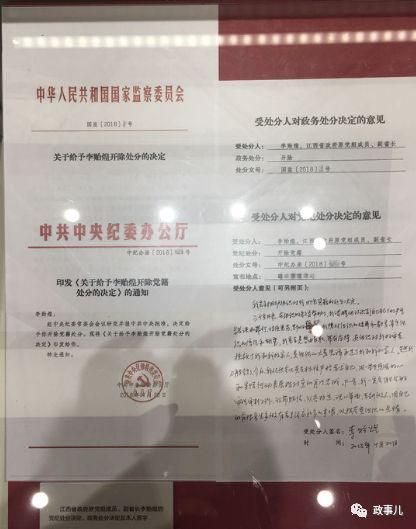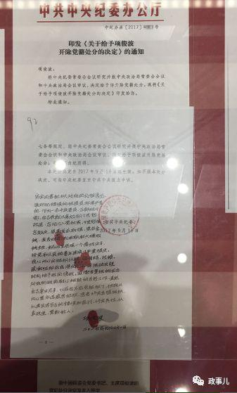 处分决定文稿显示,2017年9月18日,中纪委印发了《关于给予项俊波开除党籍处分的决定》的通知。