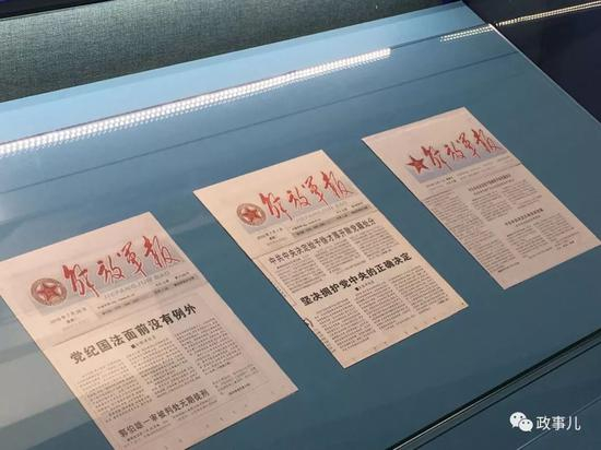 该展区还展出了刊有郭伯雄一审、徐才厚被开除党籍、房峰辉和张阳被开除党籍消息的《解放军报》版面。
