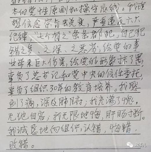 “我在政治上、经济上、工作上、生活上,都犯下了严重的不可饶恕的错误,严重丧失了一名共产党员基本的党性原则和操守底线。我理想信念宗旨蜕变,严重违反六大纪律,‘七个有之’条条都犯,自己犯错之多、之深、之恶劣,给党的事业带来巨大伤害,给党的形象抹了黑,辜负了总书记和党中央的信任重托,辜负了组织30年的培养教育。我感到了痛,深及肺腑;我充满了愧,无地自容;我无限地悔,肝肠寸断。我诚恳地向组织认错,悔错,改错。”