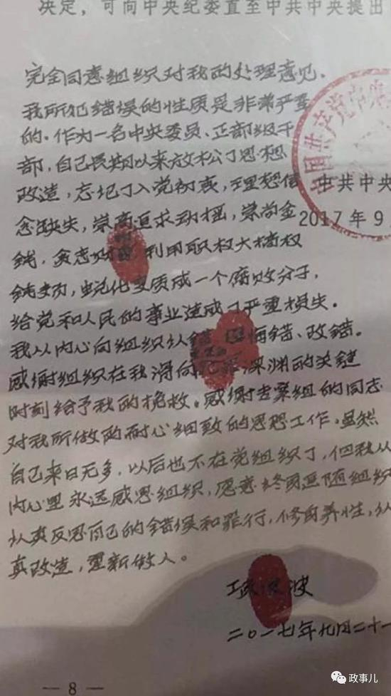 项俊波处分决定本人签字首次曝光 称自己来日无多