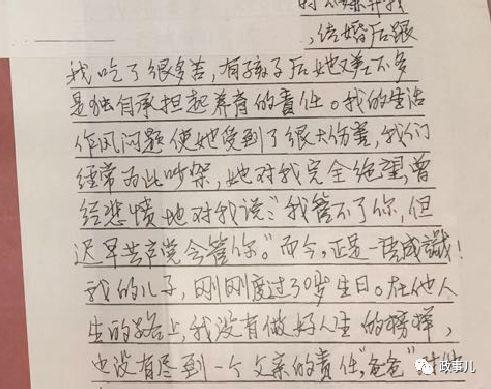 他写道,“(妻子)结婚后跟我吃了很多苦,有孩子后她又差不多是独自承担起养育的责任。我的生活作风问题使她受到了很大伤害,我们经常为此吵架,她对我完全绝望,曾经悲愤地对我说:‘我管不了你,但迟早共产党会管你。’而今,正是一语成谶!我的儿子,刚刚度过30岁生日。在他人生的路上,我没有做好人生的榜样,也没有尽到一个父亲的责任,‘爸爸’对他……”