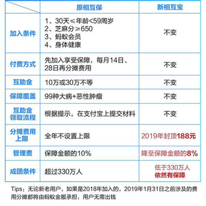 相互保还宣布,为了弥补升级对大家带来的不便,无论新老用户,只要是在2018年加入,2019年1月31日前的分摊费用全免,都由蚂蚁金服来承担。蚂蚁金服相关负责人表示,新“相互宝”中,互助申请案件的核查工作将由蚂蚁金服来负责,并将委托给专业的第三方公估机构调查处理。