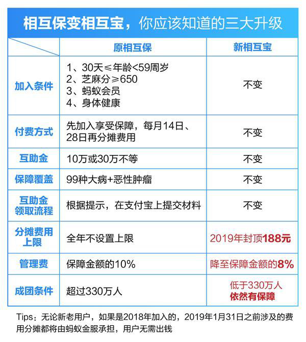 据记者了解,接下来“相互保”将会升级为“相互宝”,正式成为一款基于互联网的互助计划。升级后,老的“相互保”用户可以升级到新“相互宝”,并无需重新计算等待期。新“相互宝”还推出了一系列权益升级,包括2019年度用户分摊金额188元封顶,如有多出部分全部由蚂蚁金服承担等。如果原“相互保”用户暂不升级,则仍将按原计划获得保障;如果不愿意继续参与“相互保”,也可以选择退出。