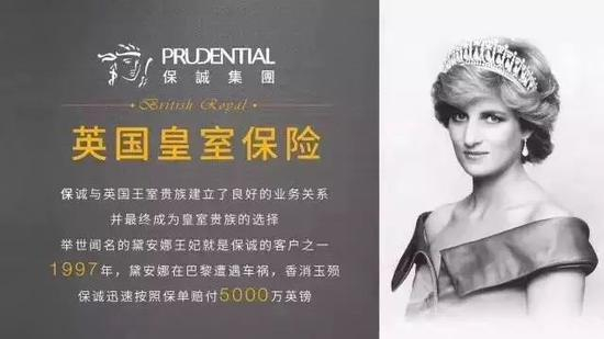 由于良好的诚信,保诚与英国王室贵族建立了良好的业务关系,并最终成为皇室贵族的承保人,举世闻名的戴安娜王妃就是保诚的客戶之一。1997年,戴安娜王妃在巴黎遭遇车祸,香消玉陨,保诚迅速按照保单赔付5000万英镑。