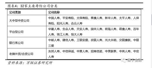 为更好地反映不同经营模式寿险公司负债成本的差异,研报分析师将该32家寿险公司分为大中型中资、平台型、银行系、老牌外资/合资四类,其中平台型公司主要是指前几年以生命、华夏、安邦等为代表通过高利率成本的理财型业务迅速崛起的公司,具体分类如下表所示: