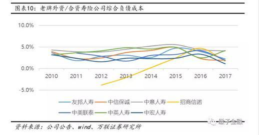 受益于此,2010年以来,7家老牌外资/合资公司的平均综合负债成本均在4.5%以下,2017年仅为2.5%,低于产品利率成本(定价利率2.5%,考虑分红后利率成本应高于2.5%),说明非利差利源(死差、费差等)对利润是正贡献。