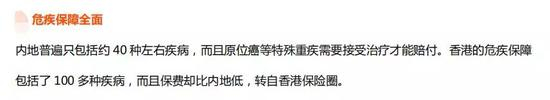 2.香港保险在保障上没有优势,香港保险的轻症一般都是占主险保额的,在保障病种数量、保障范围上也已经开始落后内地了。
