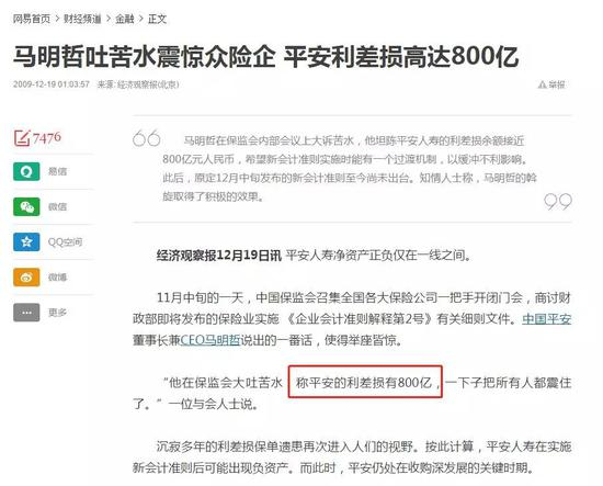 即使这样,2009年,平安掌舵人马明哲大倒苦水说,平安的利差损有800亿。消息一出,股市震荡。